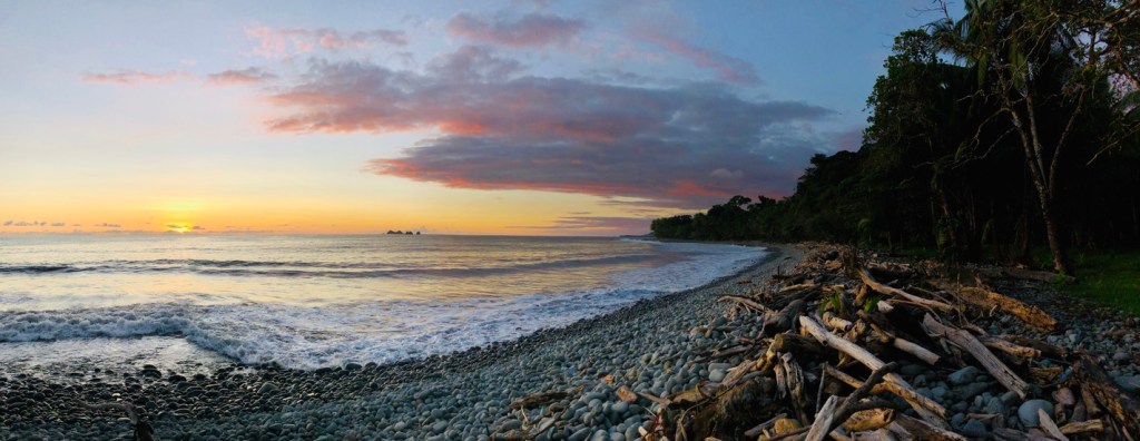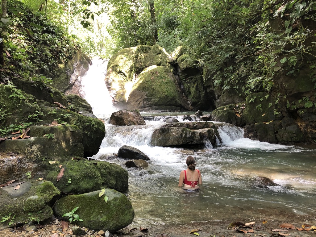 Not to be outdone, our next destination following Santa Theresa was the small town of Ojochal – dubbed the “food capital of Costa Rica”. North American and European ex-pats had gravitated to this quiet hamlet set between the black-sand beaches of the southern coast and the jungle-clad mountains of the interior, with many of them opening acclaimed restaurants. So, with high expectations of indulging ourselves in various international cuisines during our three-day stay, we rolled into town just as the sun set. We wound up the main road through the jungle, following the course of the Rio Balso to our lodge – El Mono Feliz (The Happy Monkey). Without a doubt, any monkey would be happy, if not ecstatic, to be staying here. The property is covered with lush, colorful foliage, offers an inviting pool at its center, is a haven for all kinds of birdlife and the wooden platform, at the rear of the grounds along the river, has hammocks for relaxation and contemplation. While I don’t think Ojochal lived up to it’s nickname (in no small part to the abundance of closed restaurants due to the pandemic), especially coming on the heels of our ‘foodie’ experience in Santa Theresa, our accommodation was certainly enjoyable. We did visit a couple beaches for strolling and sunsets, and spent the better part of one day relaxing in the Cascada Ojochal (waterfall). We don’t usually make an effort to visit waterfalls, finding them to be crowded and noisy (especially on a weekend) and not particularly relaxing. But the cascada was close to town so we gave it a shot. A short drive to the base of the mountains behind town we came upon the sign marking the entrance through a private residence. A young man greeted us, took a nominal entrance fee and directed us down the trail behind the family home, which was lined with cacao and banana trees and flowering shrubs. We descended a short ways into the canyon to find a two-tiered waterfall, several shallow pools for swimming, moss- and lichen-covered boulder walls leading up to a thick canopy overhead. Not another soul around – on a Sunday! While it took a couple minutes to work up the courage to plunge into the cool water, once in it was a delight to move between pools, float with the current and soak away the afternoon. When we finally dragged ourselves out of the water, we relaxed on some smooth rocks, the only sound being the crash of the falls. Overhead we caught sight of a toucan perched in the canopy. It was a great way to spend part of the day, which would precede a fine lunch at a local soda (cafe serving typical fare) before heading to a quiet beach for sunset. Not a bad way to spend the day on the Pacific coast.