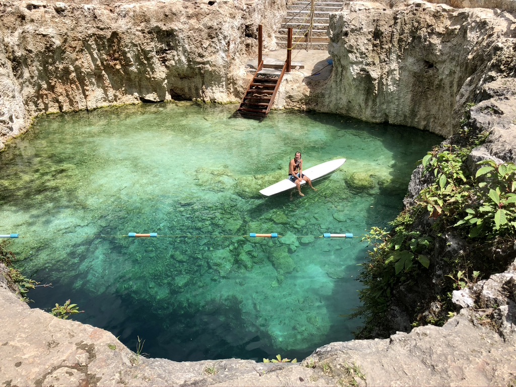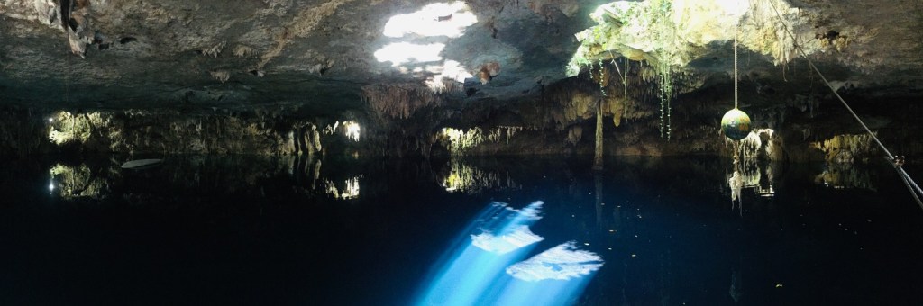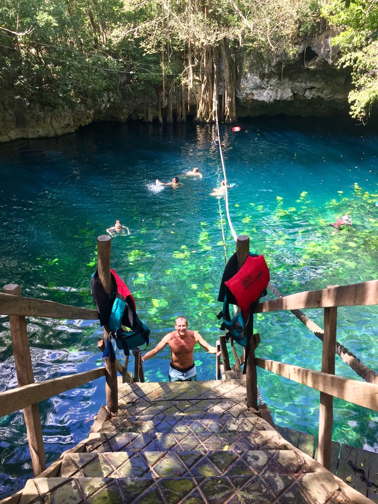 Another attraction to Puerto Morelos lies a few miles inland. Las Rutas de Cenotes runs from Puerto Morelos to the inland town of Leona Vicario, a straight stretch of highway covering just over twenty miles. The cenotes – fresh water-filled limestone sinkholes – that line the ruta range from small open-air pits (maybe featuring a rope swing) to enclosed caverns with a narrow opening and even one with a series of connected caverns each having it’s own small access. Over the course of two mornings we visited three different cenotes and found total enjoyment in each kind. Our first day we were lucky to be the only visitors at the Kin-Ha cenote, an enclosed cavern with one narrow opening providing access and light. Afterwards we drove to the Verde Lucero cenote and joined a handful of others floating in the cool waters of the open-air cavern under a sunny sky. On our second trip to the ruta, we spent the better part of a day (with new friends from our guesthouse) exploring the interconnected caverns of the Siete Bocas (Seven Mouths) cenote, then relaxing under one of their palapas, sipping beers and watching others jump into the deep pool of an open section.