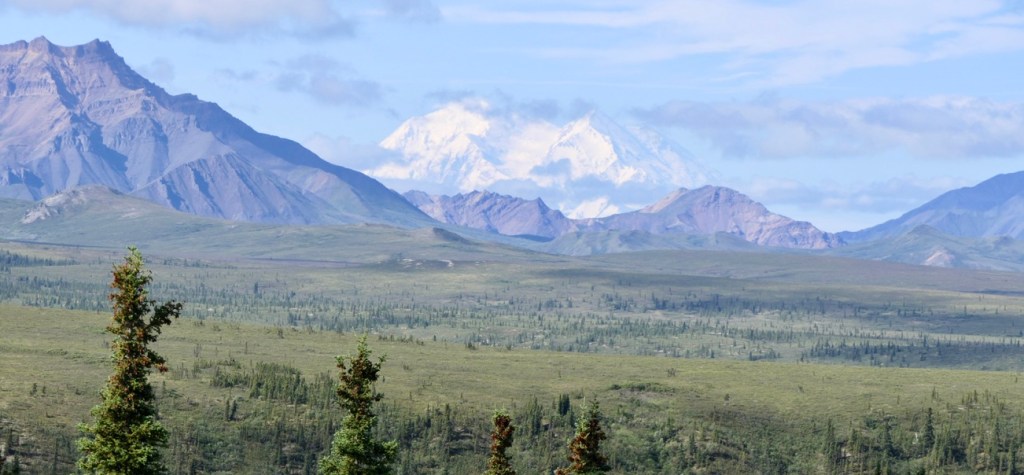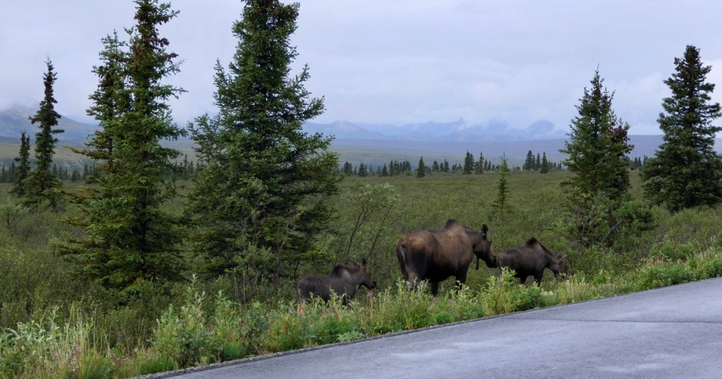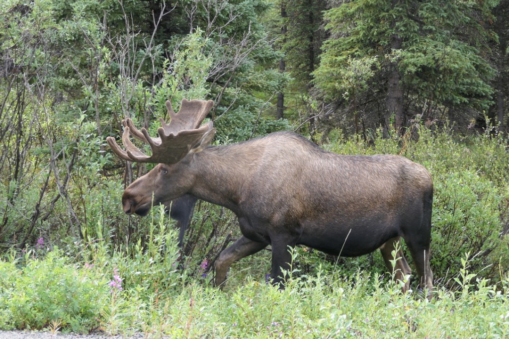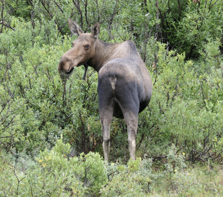 If a visitor to central Alaska wants to see North America’s highest peak, they need a good dose of luck. Persistence is helpful too. Of the 600,000 folks who visit Denali National Park and Preserve every year, only about one-third will get the chance to see the massive mountain in all it’s glory. The rest might get a glimpse of a portion of it’s snow-covered slopes, but probably will see nothing at all, as clouds completely cover the mountain most of the time. In the weeks leading up to our Alaskan trip, the weather reports for all the areas we would be visiting were not good. As departure day approached we started to see some improvement in the forecasts for Seward and Homer, and those proved accurate. But the forecast for the Denali area never faltered – rain and cool temperatures were expected, and that’s what we got when we arrived on a Tuesday afternoon. Over dinner that night we consoled ourselves with the thought that while we probably wouldn’t catch sight of the mountain, the park was still known as a great place for wildlife viewing. The wild mushroom crostini, grilled sockeye salmon with house-made whole-grain mustard glaze and the seared scallops with pink peppercorn sauce were also helpful. Oh, and the bread pudding with blueberry sauce and lavender ice cream . . . very consoling. We went to bed extremely full and hoped the rain wouldn’t deter the animals from coming out the next day.