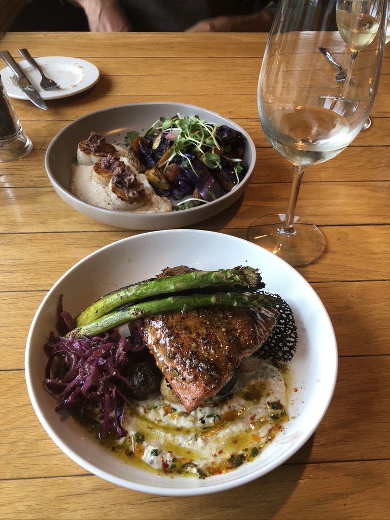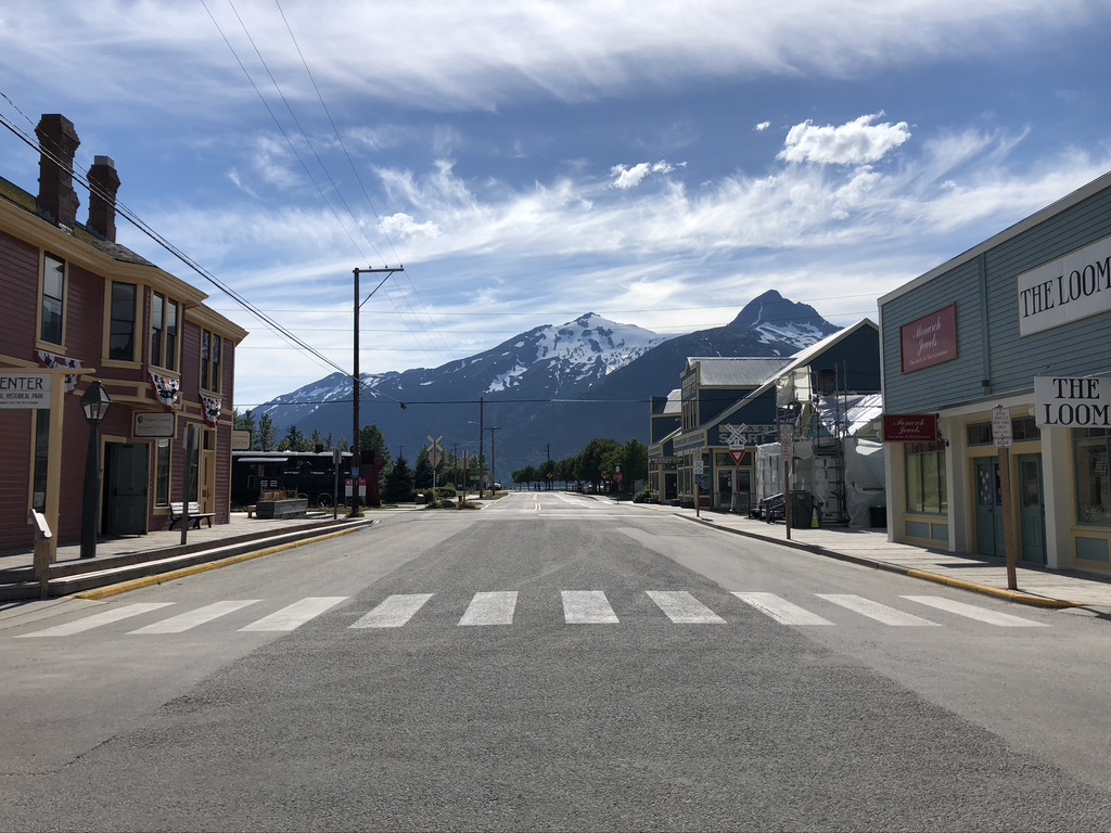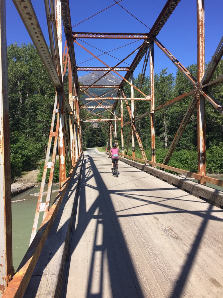 After our flight to Juneau, and a night in the state capital, we boarded the ferry for the six hour trip along the Inside Passage to Skagway. Known as a jumping-off point for prospectors heading to the gold fields of the Yukon during the rush of 1898, Skagway is now a quiet town of wooden boardwalks and old west-style buildings that house businesses catering to the cruise ships that ply the waters of the Inside Passage. On days when no ships are in port – like the full day we were in town – things can get pretty quiet. Though it was a Saturday, most shops and restaurants were closed, and those that were open only operated for a few hours. On a side street we did find Sockeye Cycle Company, which rents e-bikes, and was open for business. The owner gave us a map of the area and suggested a ride out to the Dyea town site where we could enjoy scenic views of the Chilkoot Valley and see the salmon running up the Taiya river into the smaller creeks to spawn. Sounded like the perfect way to spend the day – at least until the Skagway Brewing Company opened its doors at 4 pm. The scenery was indeed beautiful – crossing the Skagway River just outside town, cycling around Nahku Bay and then arriving at the former site of the town of Dyea, which, along with Skagway, funneled gold-seekers onto the Chilkoot Trail on their way to the Yukon. The town sat on the flats at the mouth of the Taiya river, where salmon return to spawn every summer. We left our bikes by the banks of the Nelson Slough, a small offshoot of the Taiya, and marveled at the numbers of fish choking the small stream. Bald eagles, some with a brood of eaglets, perched on driftwood, apparently already sated from feasting on the profusion of fish in the shallow waters. Eventually we mounted our bikes for the return trip and a much-deserved beer at the brewery.