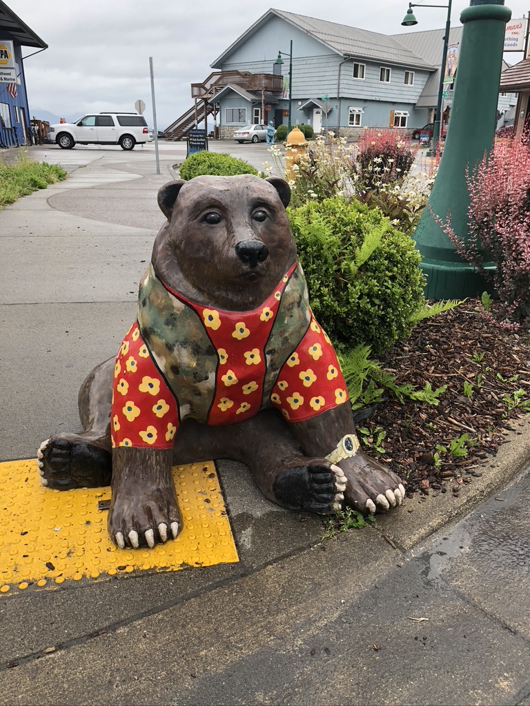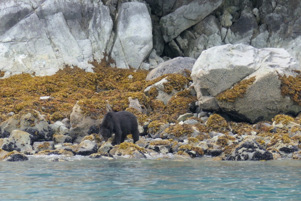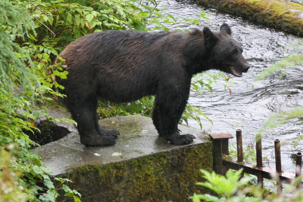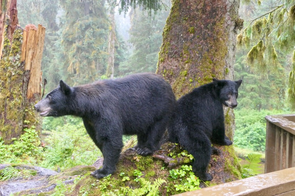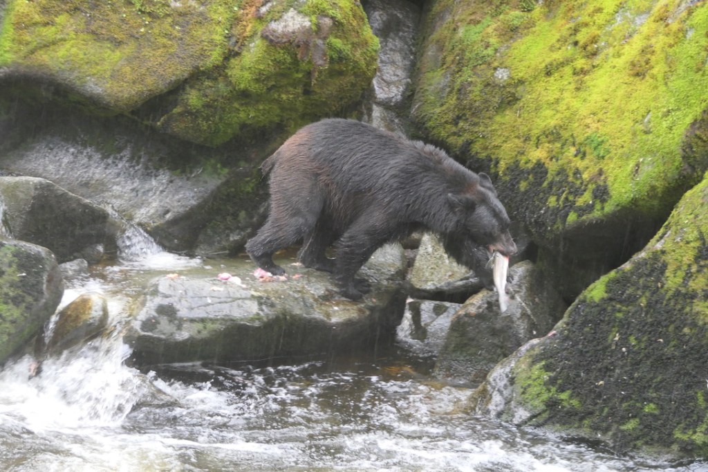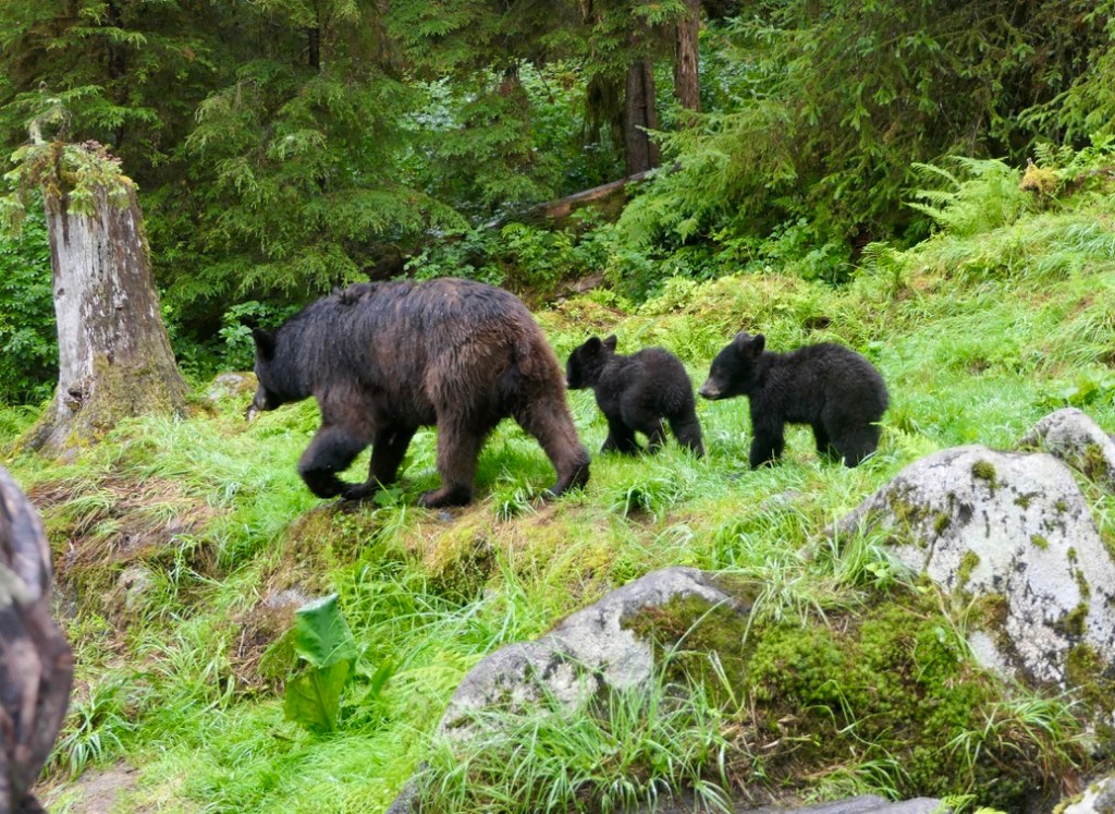 After our Glacier Bay experience we traveled south to the town of Wrangell, which sits on the northern tip of the island of the same name. Wrangell is, and always has been, a working town – its marina is filled with fishing boats of all sizes, and its history is full of colorful characters who were attracted to the areas riches. From Tlingit chiefs, Russian, Spanish, British and American traders, trappers and gold miners to famous gunslingers (Wyatt Earp did a spell as the town’s lawman) and finally the fishermen and outdoor enthusiasts who fill the town today. What attracted us was the Anan Wildlife Observatory, which sits in the Tongass National Forest 30 miles south of Wrangell. Perched above Anan Creek, which hosts one of the largest runs of pink salmon in Southeast Alaska, the observatory offers guests the chance to watch both brown and black bears feeding from the creek. We visited Anan on a rainy day with the good folks at Alaska Waters, making the hour-long trip in their new boat. We recognized just how ‘immersive’ this encounter would be when our guide slung a rifle over his shoulder to bolster the can of bear spray strapped to his belt. Instructed to stay in a tight group as we walked the half-mile trail through the rainforest, we marveled at the diverse array of ferns, mushrooms and mosses that carpeted the Sitka spruce trees and ground. Passing another small group coming out of the forest they indicated we were in for a treat – “plenty of bears up there!” Our excitement, unfettered by the falling rain, only grew. When we climbed the short set of steps onto the platform of the observatory we moved to the railing . . . and saw nothing. No bears below us in the creek. None on the hillside across the way. What the . . . had they already gorged themselves, to the delight of the previous group, and melted into the surrounding forest? But then there was movement across the creek. A solitary black bear appeared at the waters edge. Then another below us on our side of the creek. Minutes later three more black bears appeared further down stream. We moved from one side of the platform to the other trying to keep an eye on all the bears fishing for salmon. We marveled as most of them easily caught fish and carried their catch to a boulder or into a hidden area of the forest to eat. We laughed as one juvenile floundered in a pool, salmon jumping past his nose or swimming just behind him as he turned in all directions. More black bears kept appearing as time went by. Some would wander just inches beyond the railing of the platform as they moved between different stretches of the creek. As our time wound down and our guide was preparing to lead us back to the boat Heather lamented that she had really hoped to see a mother and cubs, but it didn’t appear that would happen. Until it did. Moments later a mom appeared with her two spring cubs, who huddled under her bulk while she sniffed the air, apparently trying to determine if any aggressive males were around that might pose a threat to her little ones. Satisfied, she moved her cubs to a mound high above the creek, where they contented themselves with chasing each other up a small tree while mom moved to the waters edge to catch dinner. She was quick and accomplished, returning to her young and sharing her meal. At the same time a pair of juveniles sat at the base of a tree, scratching themselves, climbing a few feet high and generally being oblivious to our presence. Finally, with hundreds of photos and several minutes of video taken, we reluctantly departed for the short walk back to the waiting boat and our return to Wrangell.