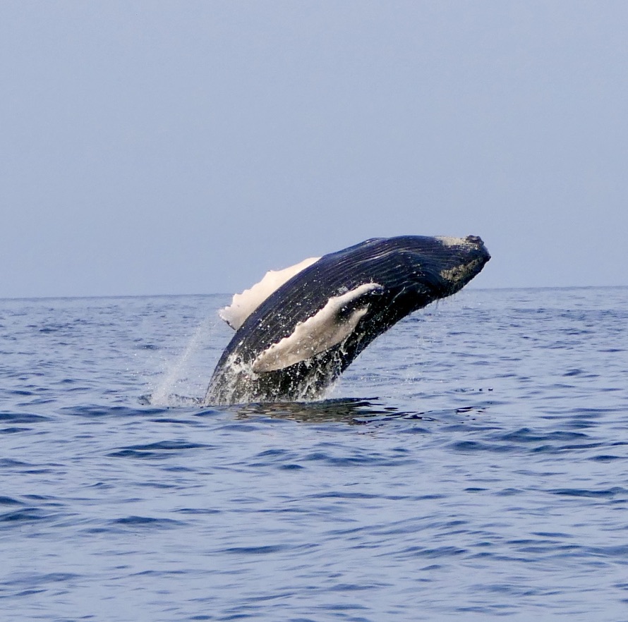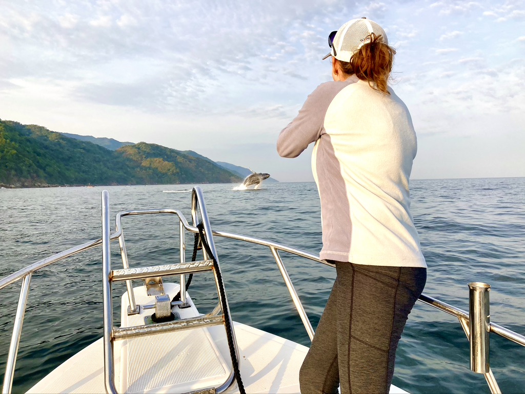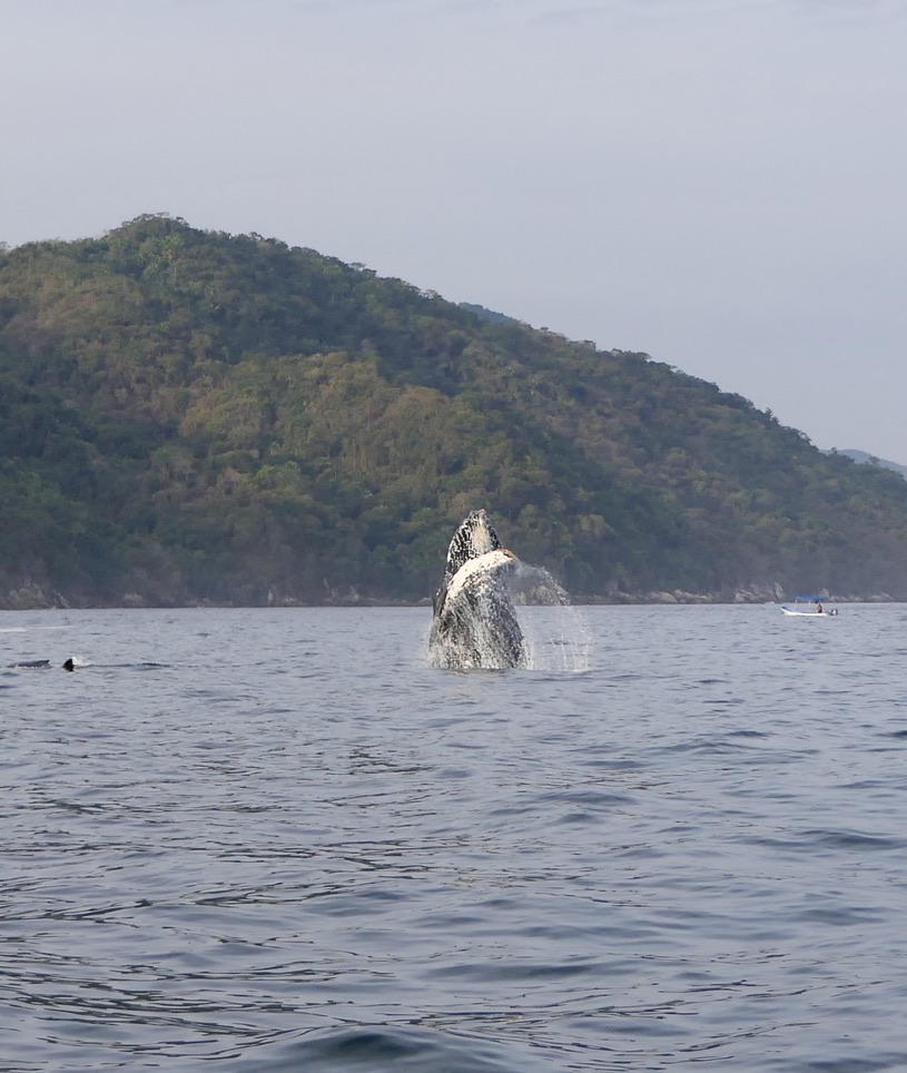 Mornings in Yelapa are prime whale watching time, when the ‘whale soup’ is most active. Each day Heather and I would take our bowl of fruit, yogurt and granola, along with our binoculars and her camera, to the rooftop terrace of our guesthouse. Over breakfast we would watch as humpbacks would cross the mouth of the small bay, new calves often breaching repeatedly. On the backside of the building, facing the hillside, a variety of birds would sing and flit from tree to tree. Iguanas would perch on exposed limbs sunning themselves. While watching the whales from afar was exciting in its own right, we needed to get out into the ‘soup’. Our host arranged a half-day boat trip with Luis, who picked us up from the town pier one morning promptly at 8 am. We motored out of the bay into Banderas Bay proper and headed east. It wasn’t long before Luis spotted the spout of a whale in the distance. When we caught up to them, we could see it was a group of two females and a calf. For the next hour and a half we slowly trailed behind them as they spouted, showed their massive backs, leapt out of the water, showed their tail flukes before diving for several minutes and then returned to the surface to entertain us yet again. When they eventually tired of playing and submerged, Luis set out two trolling lines and we motored west towards the open sea. We passed rocky coastline, an occasional fishing shack and stretches of deserted beach before the lines started to sing indicating we had fish on. Simultaneously we reeled in two nice bonitos. With the important work of whale-spotting and fishing done, Luis turned the helm over to Heather while he prepared a batch of bonito ceviche, which we all enjoyed along with some ice cold beers he had stocked in his cooler. As luck would have it, Luis also owns a restaurant in town, and offered to cook the remainder of our catch for us the following day. At the appointed hour we found him behind the bar of La Manguito, where he introduced us to his wife (serving) and his sister (cooking). The bonito, grilled with garlic butter and served with rice, steamed vegetables and salad, was exquisite. The mango margarita was delicious and the choco flan almost stole the show.