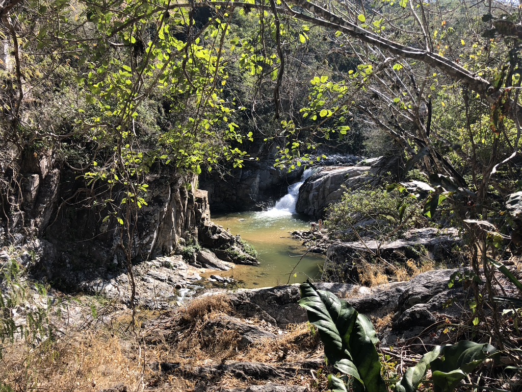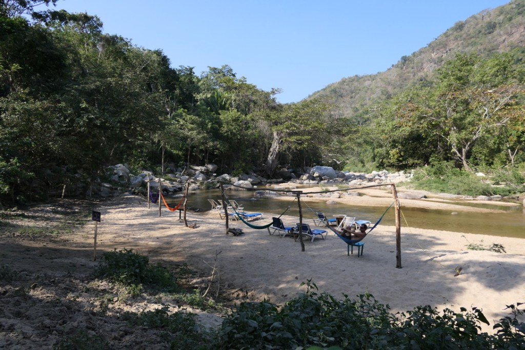 Yelapa sits on the southern side of Banderas Bay, squeezed between the forest-clad hills and the sea. As you enter the small inlet, the golden sands of it’s beach occupy the left side and it’s rambling village climbs up the hillside to the right. A river splits the two areas, tumbling down a narrow valley that reminds one of Jurassic Park. At the top of that valley, after a one hour hike, we found a cascading waterfall that filled a small swimming hole, a refreshing reward for the dusty and sweaty walk. About halfway along the trail, at a slight bend in the river where enough sand has accumulated to form a small beach area, we found the Jungle Garden. This family-run operation offers hammocks and loungers on the ‘beach’, simple meals from their kitchen and beer and cocktails from the bar. It’s perhaps one of the most pleasant places you could ever wish to while away an afternoon, soothed by the sounds of the river, taking in the view of the surrounding forest, listening to the screech of parrots and squawking of the green macaws that frequently pass overhead. While the macaws are an endangered species in Mexico, this little valley hosts the densest concentration of the birds anywhere in the country.