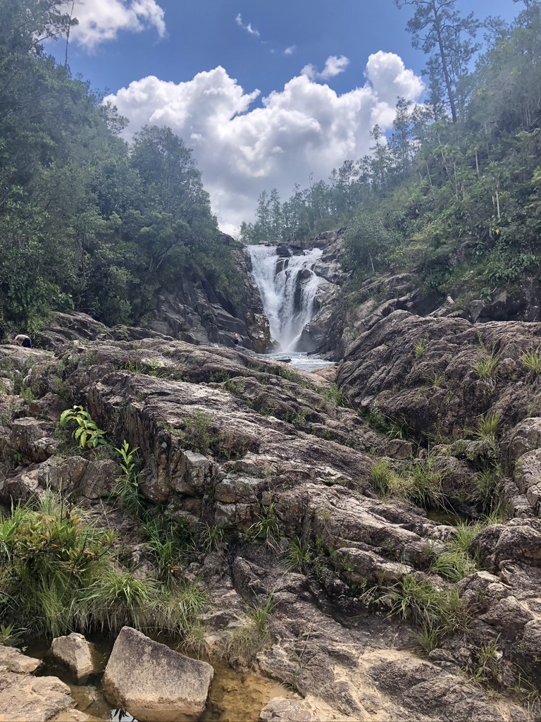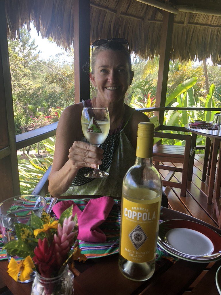 After Marcela’s breakfast, we’re off to the Mountain Pine Ridge Forest Reserve. This reserve was established in the 40’s to protect the native pine forest, which sits atop a granite massif, with areas of limestone where numerous rivers have carved out cave systems over the years. We turn off the main highway and follow a freshly paved road for fourteen miles, climbing steadily through dry forest before we reach the pines. The pavement ends abruptly, and we continue on a pot-holed dirt road for another two miles to reach our first stop – Big Rock Waterfall. The small parking area has only one other car – certainly a benefit of our visit coming on a weekday. We start out on a pleasant trail which then descends down several steep sets of rickety stairs to reach the rocky riverbank. The falls are impressive and an inviting pool at its base has us slipping into the cool water as soon as we drop our pack. After a refreshing swim, we dry off in the sun while lounging on the rocks, then gather our gear and head back to the car just as several more groups arrive to enjoy the falls. We return to the road and continue several more miles south to reach stop #2 – the Rio On Pools. Here, the River On tumbles over huge granite boulders, forming cascades and pools that invite exploration. Though more remote than Big Rock Waterfall, this place is swarming with families and couples, lazing in the pools and relaxing on the riverbank. We follow a faint path downstream and are able to find a stretch of river to ourselves, where once again we swim and slide through chutes between boulders before walking back up on the rocks. It’s a delightful way to spend an afternoon. Once we’ve dried off again, we decide it’s time to grab an early dinner. We have our sights set on the Blancaneaux Lodge, which we had passed on our way into the Reserve. The lodge, one of several in Belize owned by the Coppola family (yes, the one of Godfather and Apocalypse Now fame), sits above Privassion Creek, surrounded by jungle, with thatch-roofed bungalows, a pool and three restaurants. With excellent food, beautiful views, a cool bar (featuring old photos of geological expeditions throughout Central America) and wines by the glass from the Coppola family vineyard, this stop was a perfect cap to our first day in Cayo.