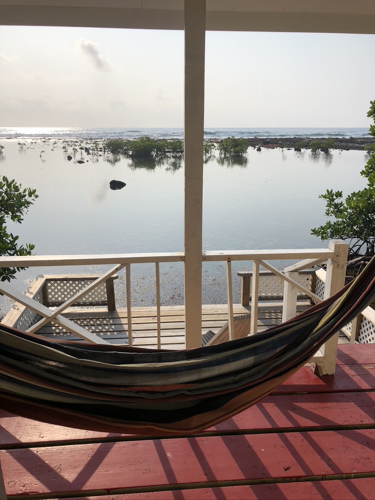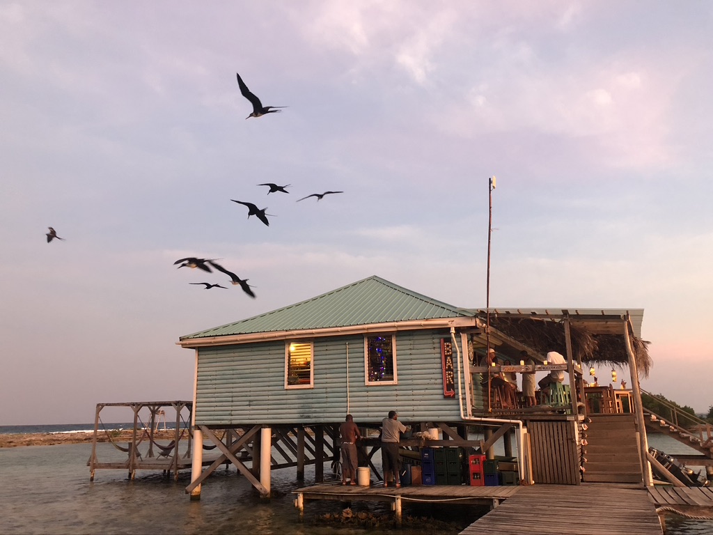 Prior to our arrival on Caye Caulker we spent four days on Tobacco Caye, a tiny speck of sand and palm trees located twelve miles offshore, smack dab on the barrier reef that runs all the way from Cancun, Mexico to the Bay Islands of Honduras. When I say it’s a speck, I mean it. Walking around the circumference of the island would take all of ten minutes – provided you stopped at the Tobacco Caye Lodge’s bar for nine minutes to have a beer and a short chat with Kirk, the bartender. We came to snorkel the reef and it’s a beautiful and lively one. We spotted a bevy of the usual reef fish along with some big stuff: nurse and bull sharks; turtles; southern, whiptail, spotted eagle and yellow rays; barracuda and perhaps most impressive of all – a school of nearly one hundred tarpon ranging in size from two to five feet in length. If snorkeling isn’t your thing, fly fishing the flats just inside the reef for permit is another activity that attracts many visitors. No matter what you choose to do during the day, everyone gathers at the overwater bar at the Reefs End Lodge to swap stories, make new friends and watch the sunset.
