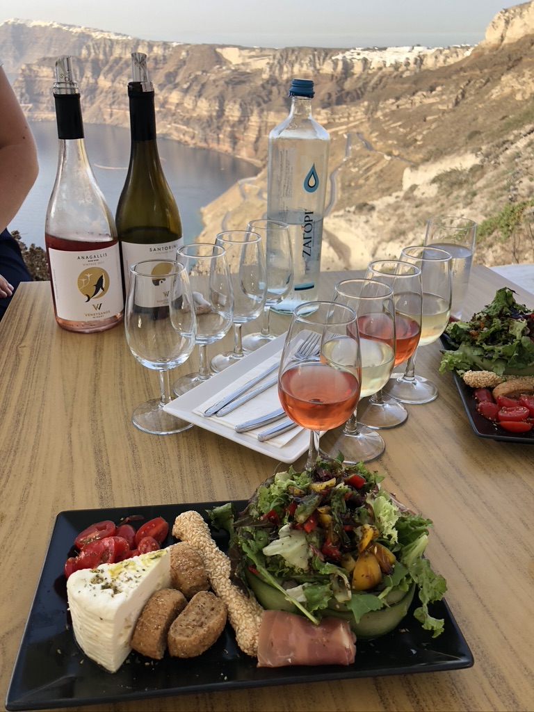 One of the attractions of Santorini is the fact it’s located on the rim of a former volcano and the views from the caldera looking over the sea to the west, especially at sunset, are breathtaking. One of the best places to take in that view is from the terrace of the Venetsanos Winery, which offers a tasting of its wines along with plates of locally-sourced food. We grabbed a table about an hour before sunset and our personal ‘sommelier’ poured us a sampling of the four most popular offerings – a crisp white, a complex rose, a minerally red and the islands famous ‘vin santo’ dessert wine.