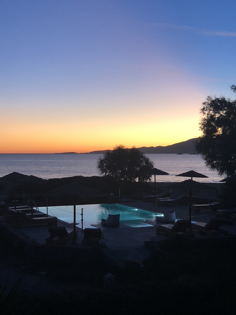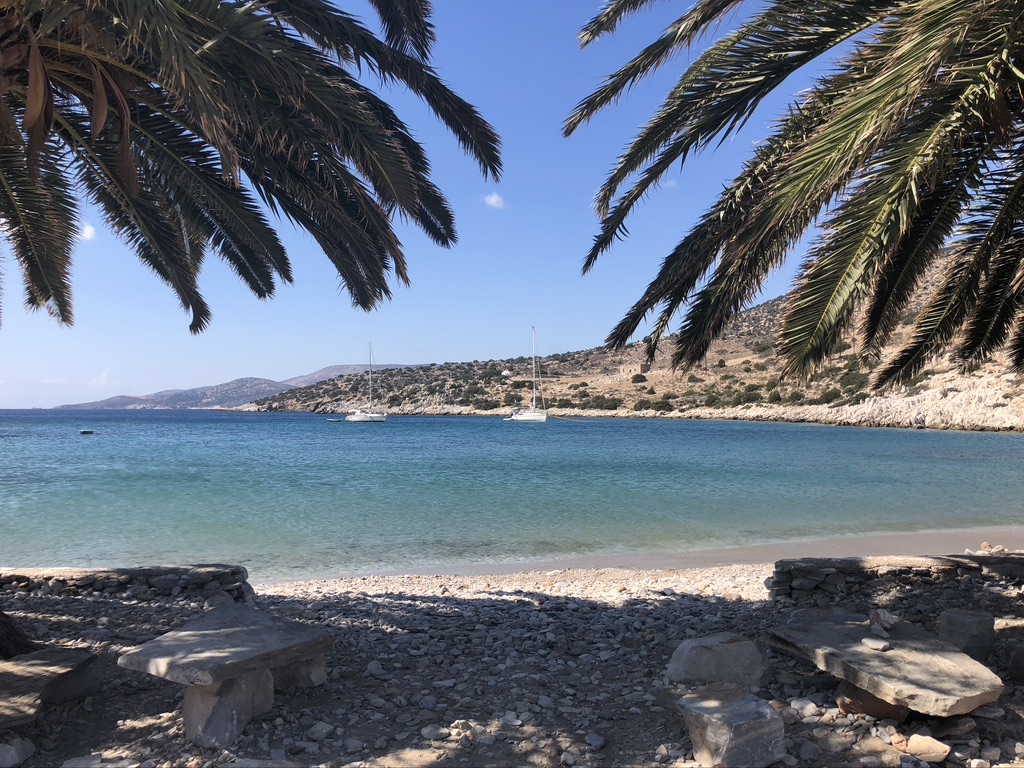 One day we drove through the center of Naxos and climbed over a mountain pass before descending to the coast on the eastern side of the island. At Moutsounas we turned south and followed a twisting road that hugged the shoreline. The road ended at the village (as far as five stone houses constitutes a village) of Panormos, and more specifically at a dusty parking area in front of Mitatos taverna, which overlooks tiny Panormos Bay, with views even further to the islands of Koufonisia, Schoinousa and Ios. There were a few other intrepid visitors swimming in the bay, but we elected to forego the chilly water and instead enjoy a chilly beverage on the terrace of Mitatos and take in the view. Another day was spent navigating yet another dirt road to Agiossos Beach on the southwest side of the island in order to have lunch on the sun-splashed terrace of Panormitis Cafe. We dined on grilled prawns, baked eggplant, olives and baklava before heading back to our guesthouse for sunset.