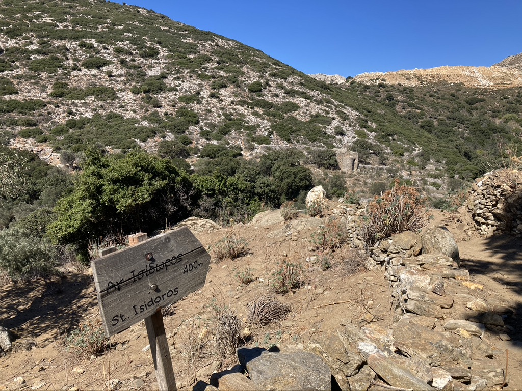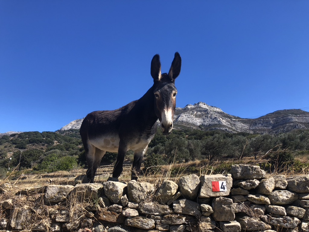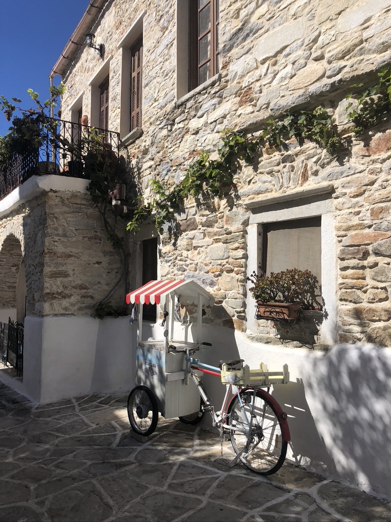 A highlight of Naxos is the well-maintained trail network, one of which connects the central mountain villages of Chalki and Moni. The trail follows a cobbled lane out of Chalki, passes several small chapels before meandering on a dirt path along a dry streambed, always ascending up the valley until reaching the village of Moni about an hour later. If you were pressed for time you could continue the loop, descending back to Chalki along the other side of the valley, but then you’d miss the experience of dining at To Panorama in the middle of Moni. We were wandering along the street when an old local, sitting on a chair outside the taverna, beckoned us in. Setting foot inside we were warmly greeted by an elderly woman. Seated at a table in the empty restaurant we asked if there was a menu. “No” replied the woman, who then listed what she had to offer us – beans, salad and bread. “Yes” we said, though with no real choice in the matter. Soon, after our cold bottle of Mythos beer was served, the plates arrived – a heaping platter of stewed fava beans in a light tomato sauce and a towering bowl of Greek salad, topped with a thick slab of feta cheese dusted with oregano. A basket of bread rounded out our lunch. We happily munched our food while taking in the ‘panoramic’ views of the valley from the large windows. Reluctantly, with full stomachs, we departed for the return to Chalki, descending through olive groves and vineyards, stopping to pick pomegranates from a tree whose loaded branches were drooping over the rock wall beside the trail, passing a lonely donkey who walked with us the length of his pasture until the fencing prevented him from going any further and wandered through the charming, nearly deserted village of Kaloxylos before reentering Chalki, where we treated ourselves to dishes of ice cream made from local cherries and strawberries.