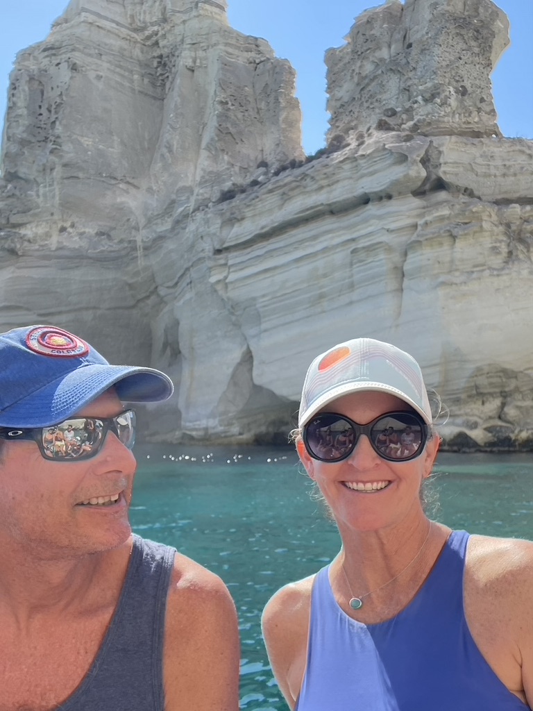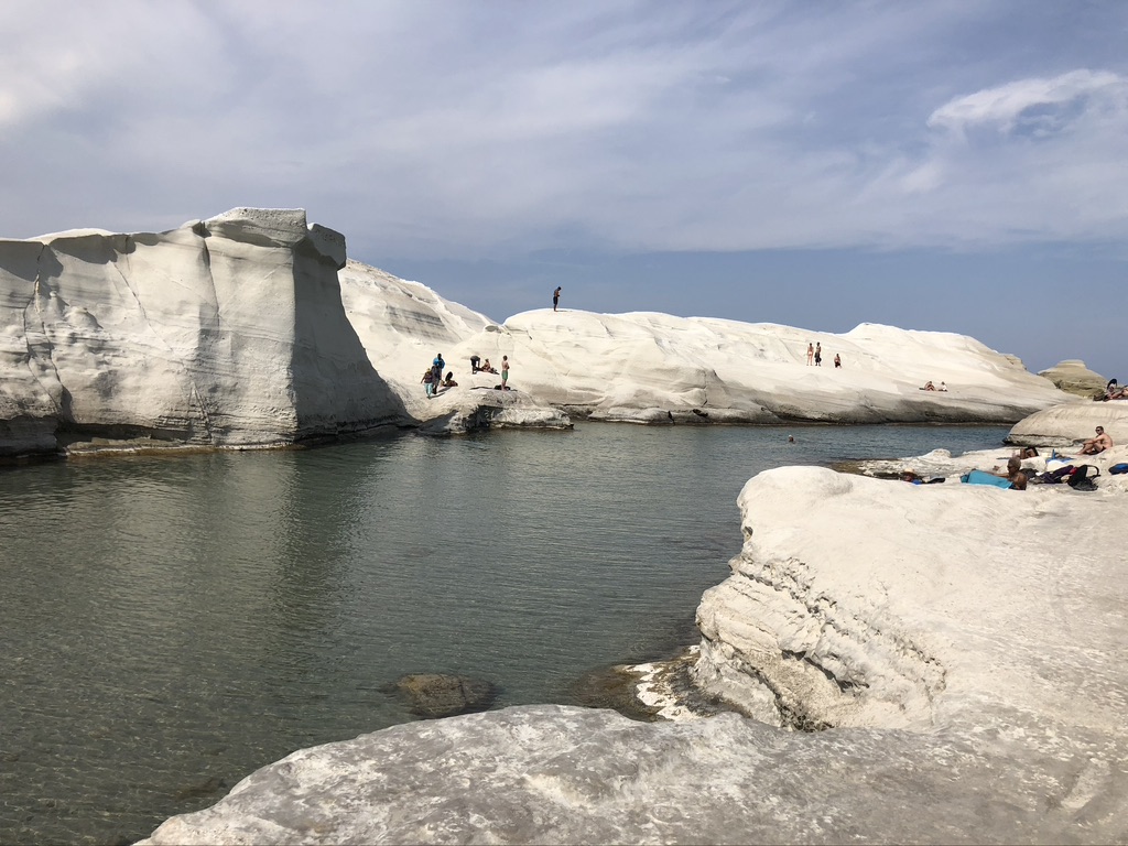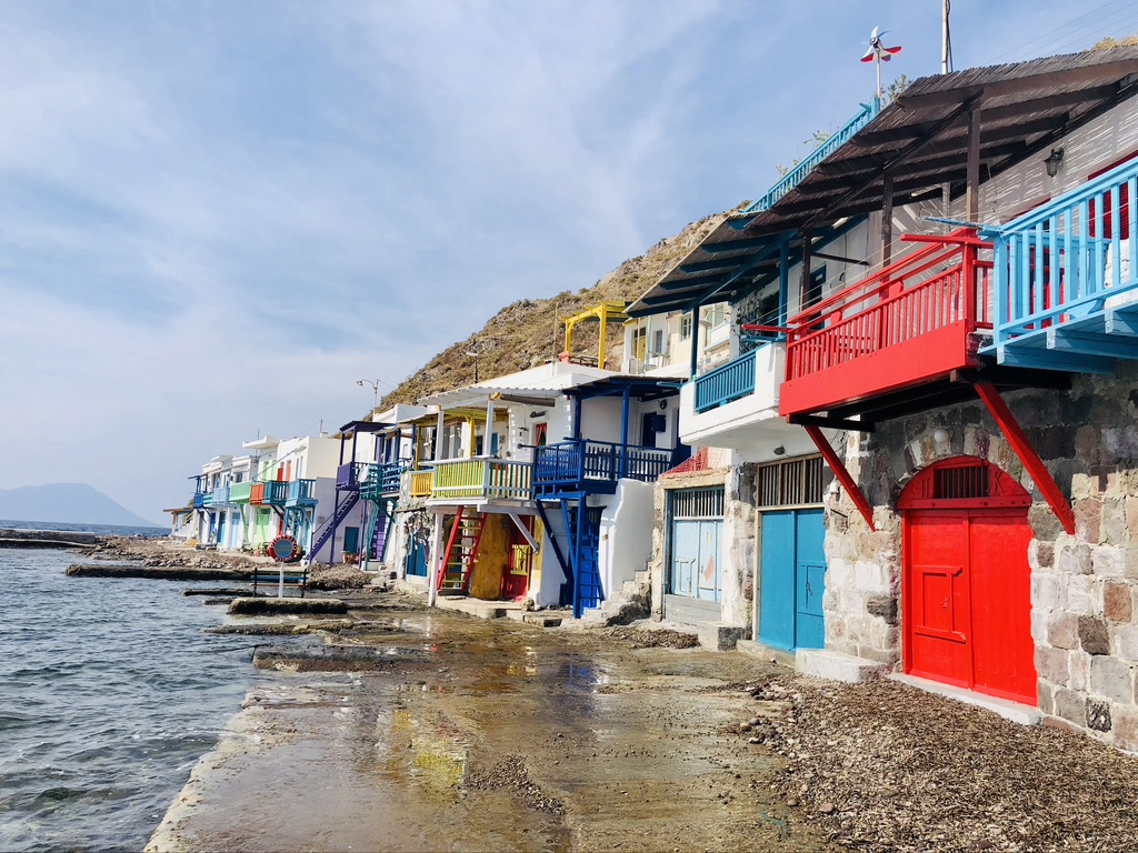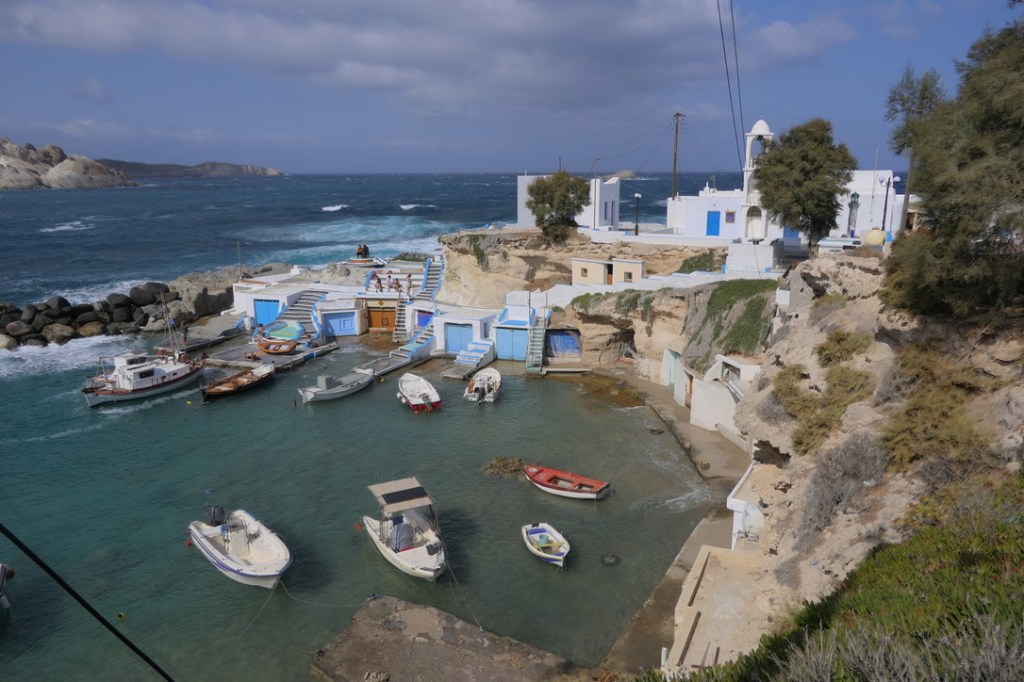 We had based ourselves in the village of Pollonia, on Milos’ northeast coast, for our stay. With a rental car we would be able to explore the island and visit beaches (Sarakiniko in the north and Fyriplaka on the south coast); the unique village of Klima, with it’s colorfully-painted ‘boat houses’; the remote seaside village of Mandrakia and the main town of Adamantas, which hosts the ferry port, a marina for sail boats and a string of tavernas along the water. In Pollonia itself, we only had to walk a short distance for excellent seafood at places like Enolian (steamed mussels and grilled sea bream), Yialos (grilled calamari and pasta with shrimp) or Alkis (fried calamari). As a bonus, just on the edge of town we found the Kostantakis Cave Winery, which offered tastings of its line of white, rose and red wines as well as a couple distilled spirits in a comfortable outdoor setting at the mouth of its cave storage cellar.