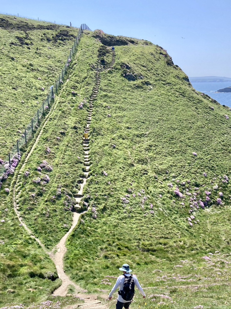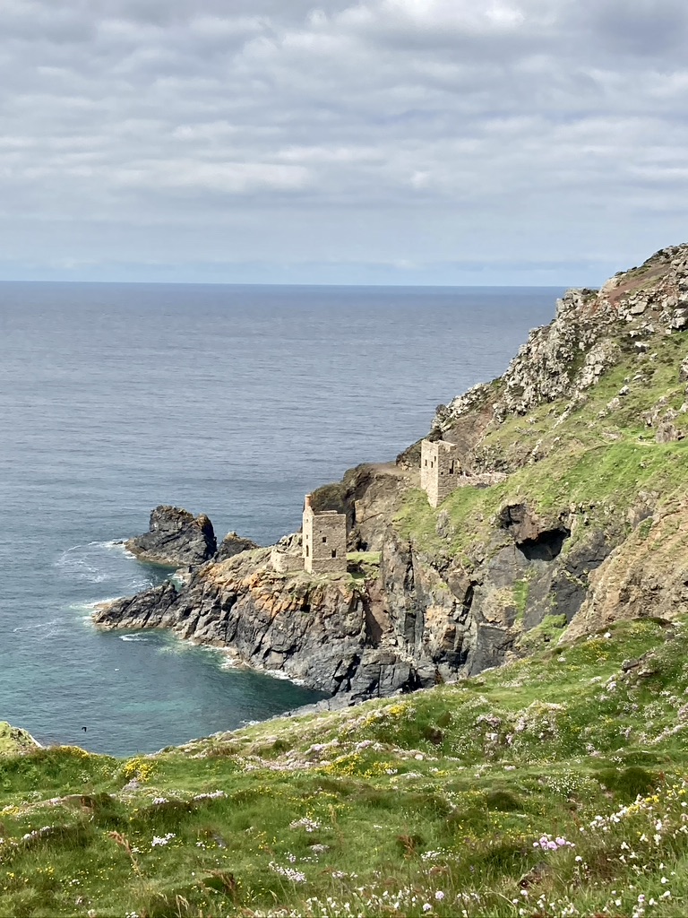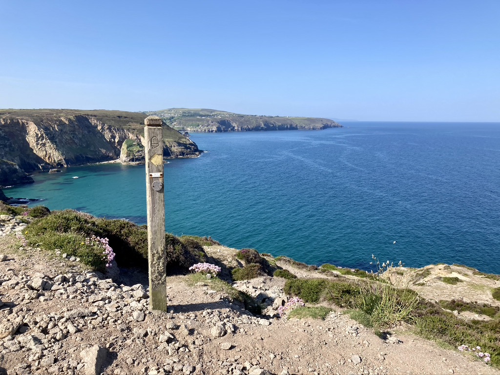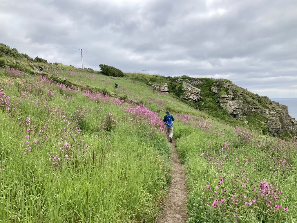 Leaving Zennor the next morning, a friendly farmer pointed out a shortcut through his property that took us back out to the coastal path and we were on our way past Gurnard’s Head, Porthmeor Cove and the Pendeen Lighthouse before stopping for lunch at a cafe outside the Geevor Tin Mine. We had entered the ‘Tin Coast’ of Cornwall, with much of the next two days passing the ruins of the areas mining heritage. We ended the day in St. Just, joining the locals for a few pints at the King’s Arms, relishing the sunshine from the tables outside overlooking the town square. Day 6 would take us around Land’s End, England’s westernmost point, and what turned out to be a mostly disappointing over-commercialized fun park. Folks were lined up to have their pictures taken at the Land’s End sign, the fudge shop was doing a brisk business and, if one wanted to, indoor mini-golf was on offer, along with a petting farm and a pirate museum. We quickly pressed on and soon left the crowds behind to enjoy the quiet of the clifftop and fields of flowers before descending to the small village of Porthcurno, our next-to-last stop, and our room at the Seaview House B&B. Tiny Porthcurno had no pub or restaurant, so we had to call a taxi to take us to the nearby village of Treen, where we found the popular Logan Rock Inn and it’s sunny garden. A couple rounds of beer were followed by an outstanding meal of crab bisque and grilled mackerel.