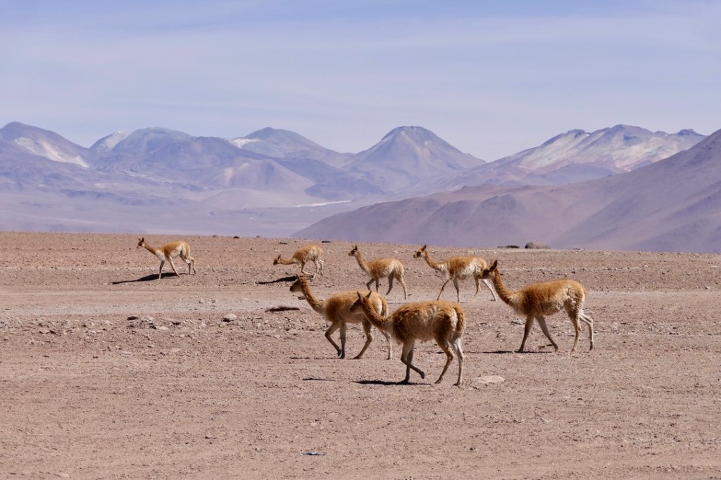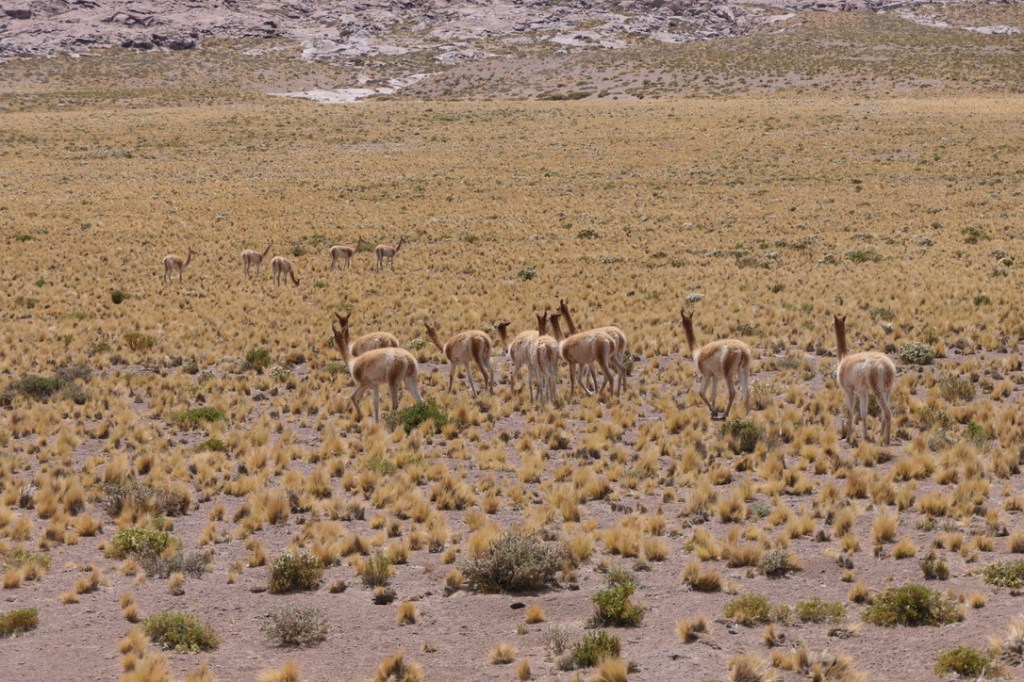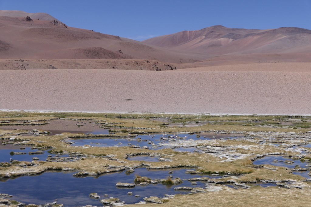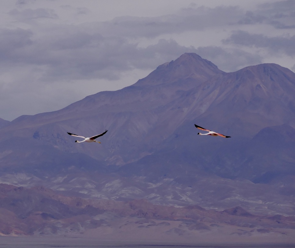 On our second day, we drove east from San Pedro headed to the Reserva Nacional Los Flamencos, lying on a high-altitude plateau abutting the border with Argentina. After climbing from town we passed a series of volcanic peaks before eventually reaching the reserve. A small wetland area hosted dozens of guanacos, flamingoes and ducks, a respite of water and green space tucked between the dry rocky peaks of the Andes. A half hour further took us to two more lagunas, or salt lakes, at the center of the reserve. Here too we spotted guanacos feeding on the sparse grasses at the edge of the lakes and flamingoes wading in the shallow waters.