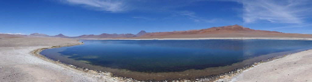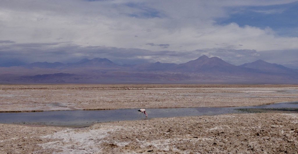 The next day we drove south for a couple hours, climbing to an altitude of 13,500′ before reaching the lagunas altiplanicas, or high-altitude lakes, of Miscanti and Miniques. Set at the base of yet more volcanic peaks, the lakes hosted a herd of vicunas, a relative of the guanaco, as well as flocks of flamingoes. Leaving the park we wound down the road through meadows of short grasses and yellow flowers, eventually reaching the desert floor and heading back north towards San Pedro. Just past the town of Socaire, we turned off the highway and headed towards our next stop, the salt flats of the Parque Laguna Chaxa. The floor of the desert here was streaked with white – the salt remaining behind after what little water had made its way down from the surrounding mountains to evaporate from the basin of Laguna Chaxa. In the small lakes that remained on the desert floor, dozens of flamingoes stalked through the briny water to feed on the shrimp larvae that existed there, and which provide the pinkish hue to the birds feathers.