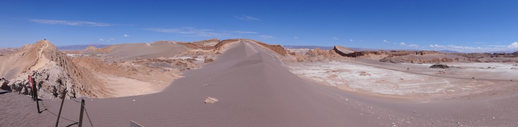 That, from a Chilean couple dining next to us one morning, was an apt description of Chile’s geography – long and narrow and pinched between the Pacific Ocean and the soaring peaks of the Andes. Stretching for 4,000 miles from the Peruvian border in the north down to Cape Horn and the Straits of Magellan in the south, and no more than 110 miles wide, one only needs to travel north and south to see the country. We began our visit up north, after flying into Santiago, the capital, and connecting to a domestic flight to Calama before picking up our rental car and heading out to the Atacama Desert for a few days of exploration. San Pedro is the only town of any size in the Atacama, home to the lodges, tour operators and restaurants that host and serve the visitors looking to explore the surrounding desert. Highway 23 runs from Calama through San Pedro before turning to the frontier with Argentina. Along its path a number of lesser traveled (and lesser-paved) roads head out to the various attractions lying in the barren expanse of the Atacama Desert. When we left Calama on day 1, we turned off Highway 23 to explore Valle de Arcoiris – Rainbow Valley – passing through a gray landscape of bare rock and sandstone, occasionally spotting small herds of guanacos – a relative of the llama – before descending down to the Rio Salado, which flowed into the Valle de Arcoiris. After stopping at the ranger station at the head of the valley and paying our entrance fee, we drove into the valley to stop at a number of parking areas to explore and take in the views of the multi-colored rock formations. After our visit we backtracked to the highway and continued on to San Pedro to check into our accomodation and get a meal in town. San Pedro is best described as . . . dusty. By late afternoon, as the wind blows swirls of red dust over everything, visitors fill the dirt streets of the main pedestrian area, looking to book the next days tour at the slew of outfitters offices, slake their thirst at a bevy of drinking establishments or fill their bellies with steaks, burgers, pizzas, pastas, ceviche or seafood. The culinary offerings are extensive, with a heavy dose of Italian and Peruvian influences.